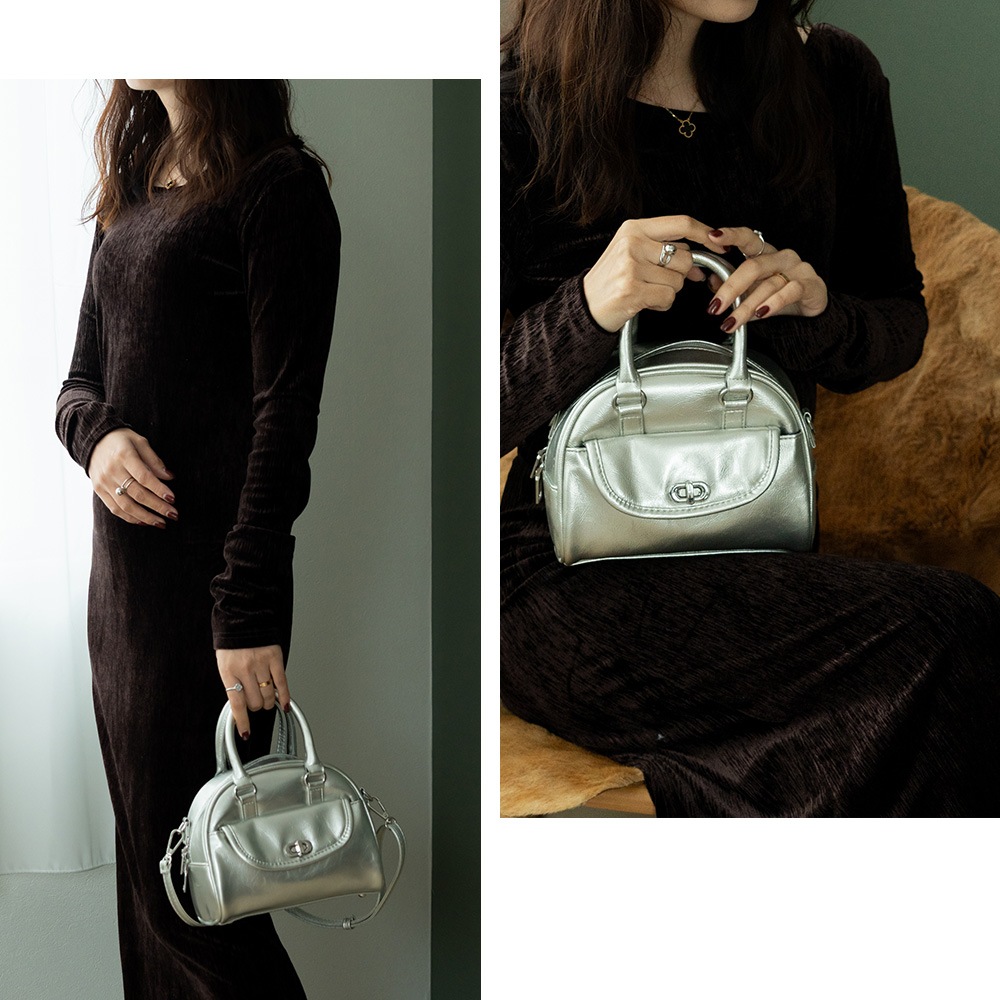 フラップ部分のゴールド金具はクラシカルな雰囲気を演出し、コーディネートにさりげない上品さをプラスしてくれます。